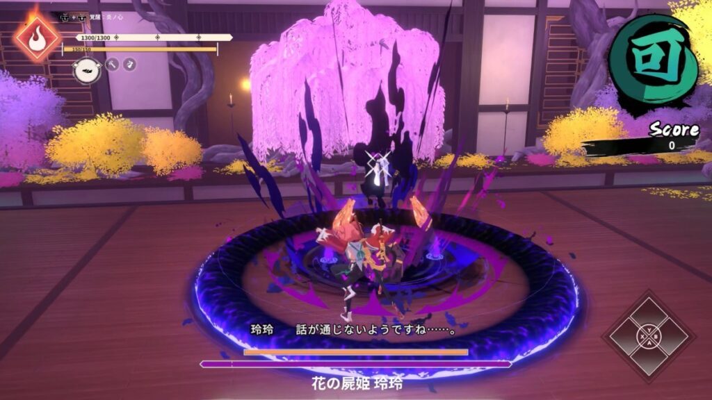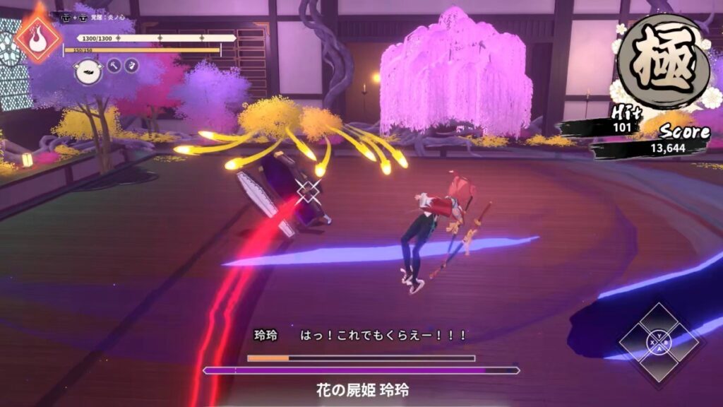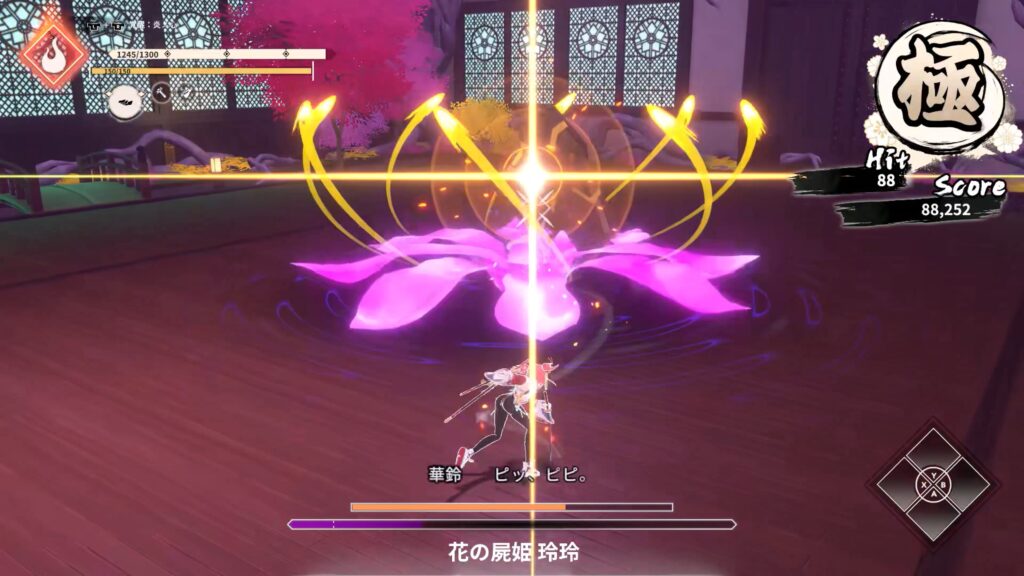 花攻撃の対処手順はジャンプで回避→右に回避→パリィで2回目を回避→3回目をタイミングよくパリィ、の順で動くと安定します。
