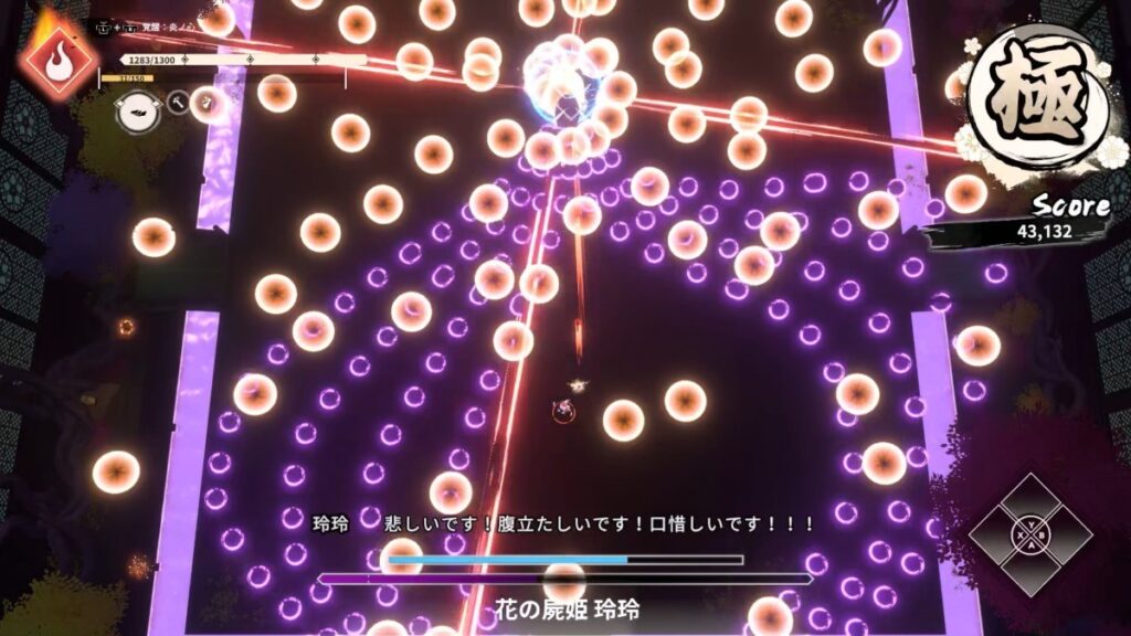 暴怒状態になると、弾幕をばら撒きながらレーザー・花・爆風による攻撃を仕掛けてきます。回避タイミングがずれると弾幕に当たりやすいため、注意が必要です。