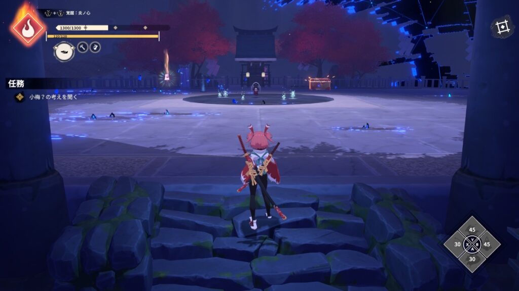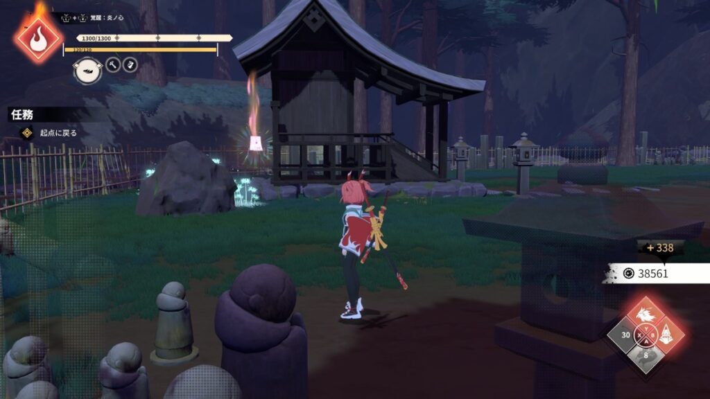 最初の雑魚敵戦の場所の祠の後ろ側。