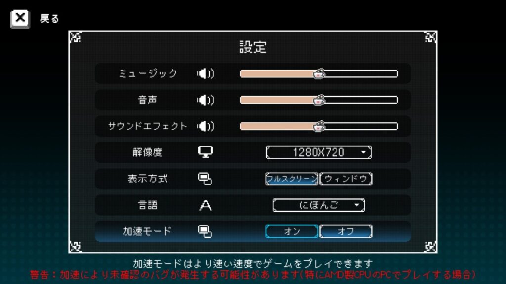 オプションには、進行速度を2倍にできる“加速モード”があります。