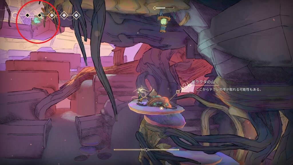 - 右上に進むと「ナクレの盆」。上に「古びたコア」があるので、敵を引き寄せてヘヤピンで登る。