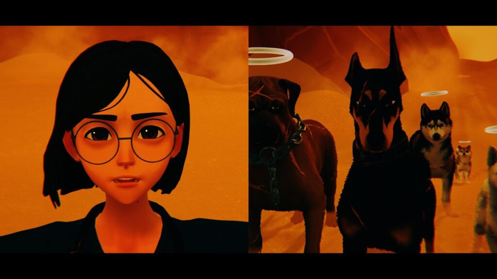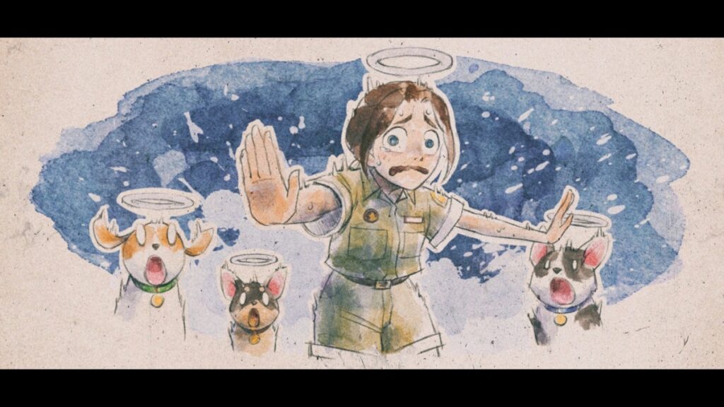 本作は死をテーマにしているため、どうしても全体的に暗い印象の場面が登場します。その中でも特に印象的だったのが、上司の命令で犬たちの殺処分を行った職員が、心身ともに疲れ果てて亡くなり、天国で穏やかに暮らすシーンです。