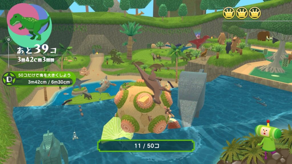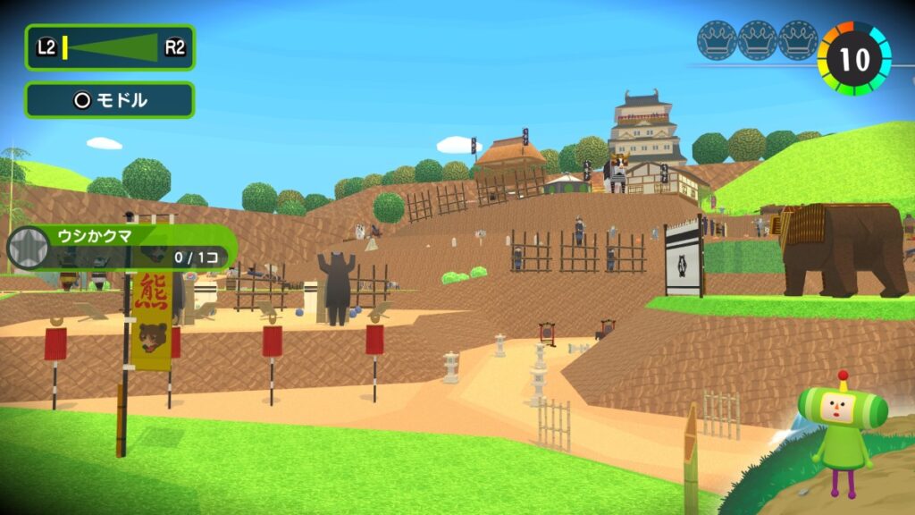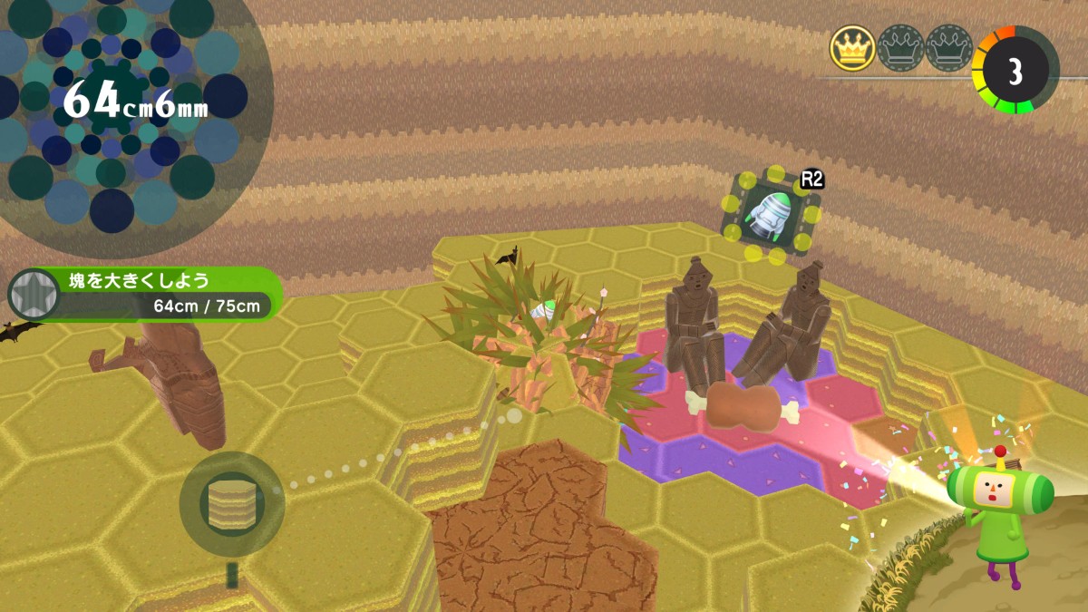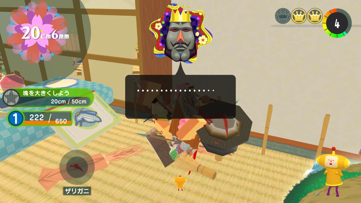 他の塊魂シリーズと同様に、今作も塊を一定以上大きくすると新しいエリアへ進めます。しかし、大きくなるたびに大様の顔が画面に割り込む演出は、ゲームテンポを少し悪くさせています。
