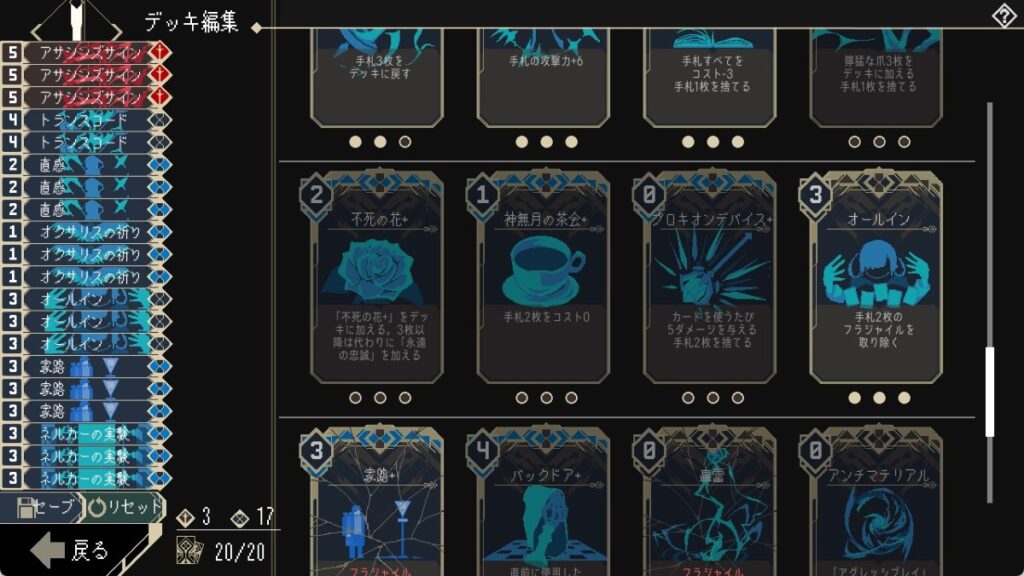- 山札が残り1枚になるように「直感」や「ネルカーの実験」を使用して調整。