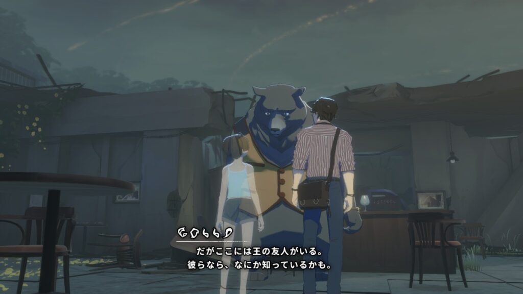 駅のホームで「王」を待つイヌや、寂れた街で「王」の帰りを待ちわびる熊。一見するとユージンの記憶とは結びつかない不思議な光景に見えます。しかし、「ナラク」と呼ばれる別世界でユージンの記憶を覗き見ることで、これらの風景が間違いなく彼の記憶をベースにしていることを知ることになります。