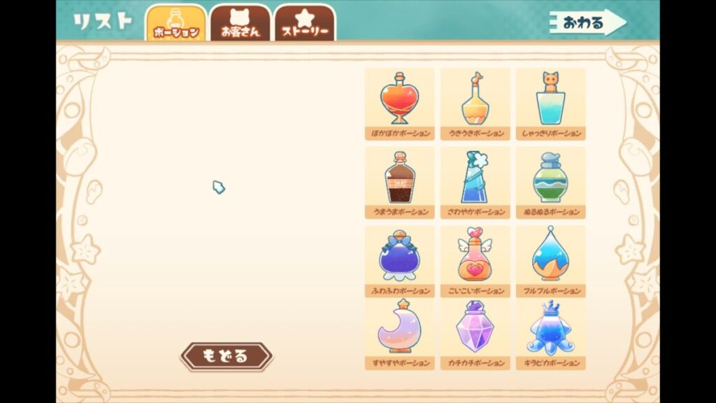 それもそのはず、キャラクターの数に対してポーションの種類が約3分の1ほどしかなく、後半は新しいポーションを作る機会がほとんどありません。